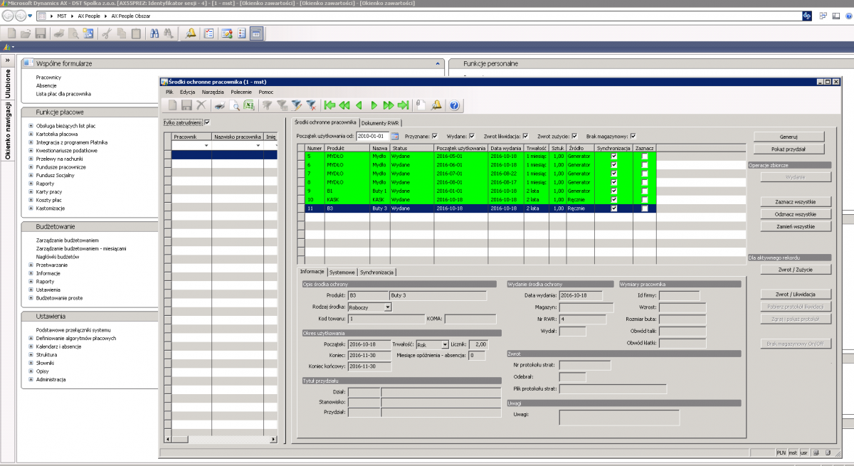 The system is also a register of work clothes. It manages the clothing based on the organizational structure and positions of the employees. Information regarding dispositions is automatically passed to the warehousing module and its state is modified to reflect the resource quotas.